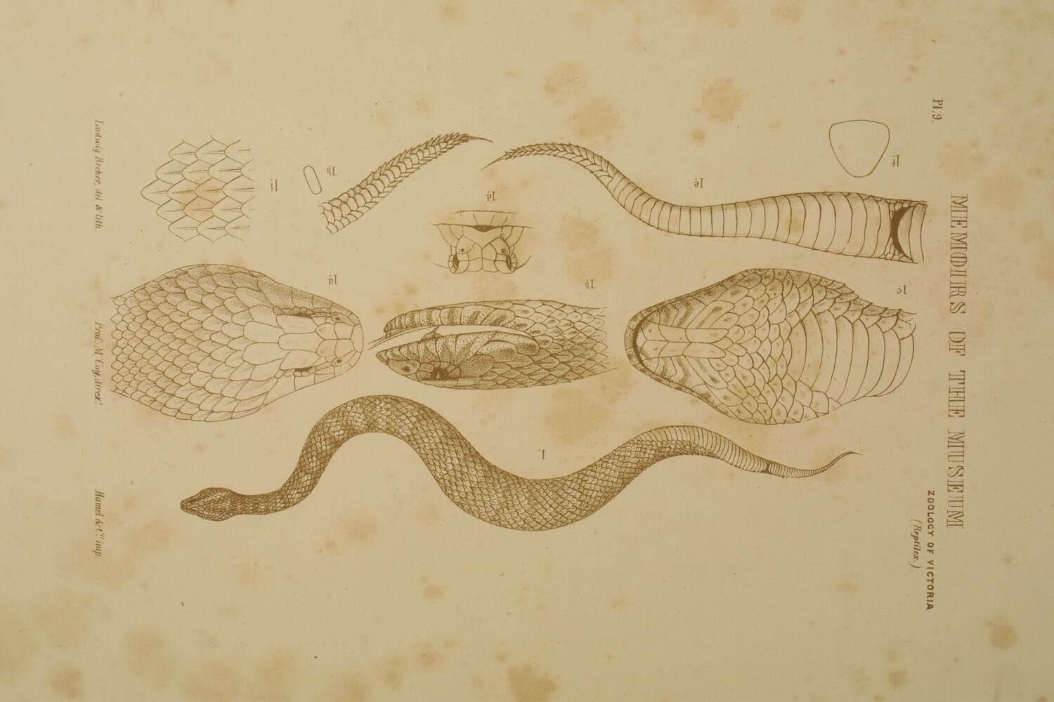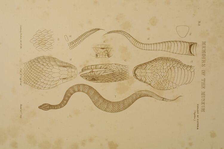 Lithographic single colour proof of a Death Adder, Acanthophis antarcticus, form near the Murray River, by Ludwig Becker for published Plate 12 of the Prodromus of the Zoology of Victoria by Frederick McCoy.