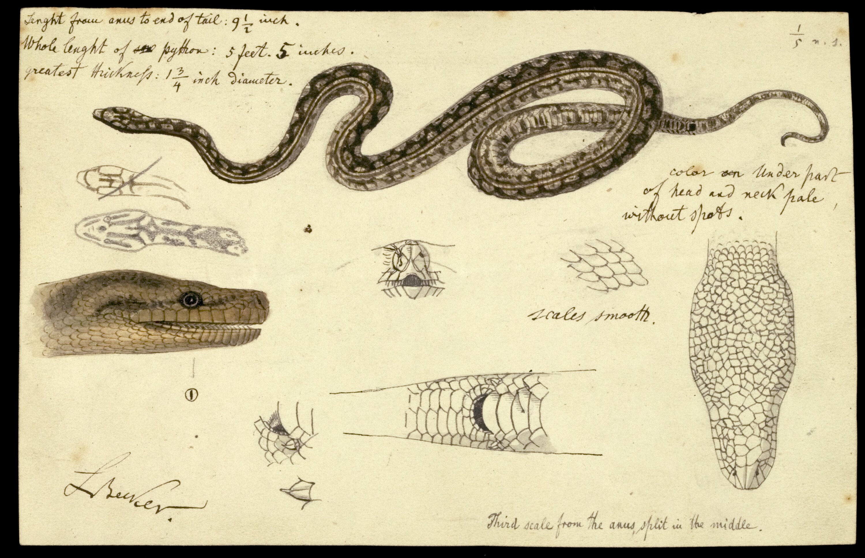 [Dimensions, description of colour, texture of scalesalso interesting note, re split scale near anus]