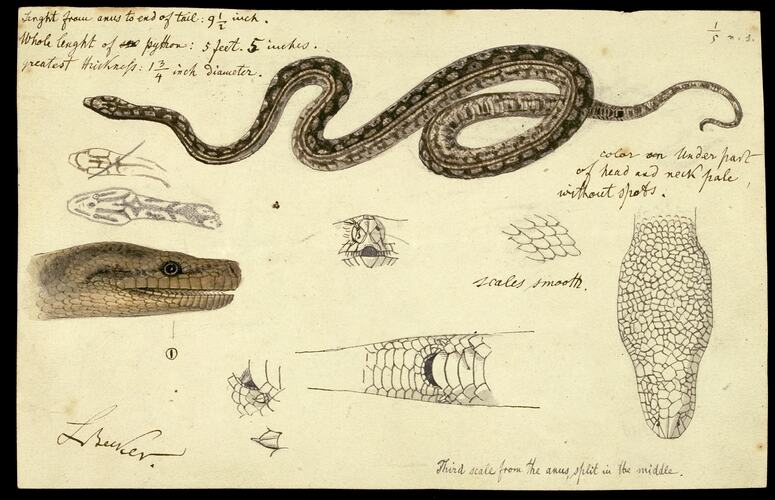 Carpet Snake, Morelia spilota variegata Gray by Ludwig Becker. Unnumbered drawing a, pencil, watercolour, indian ink and varnish on paper, 13cm x 20cm. Drawing for Plate 13 in The Prodromus of the Zoology of Victoria by Frederick McCoy.