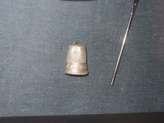 Metal thimble with 'pocked' imprint and decorative imprint border (Greek-Key design). Thimble shows signs of use and is considerably dented.