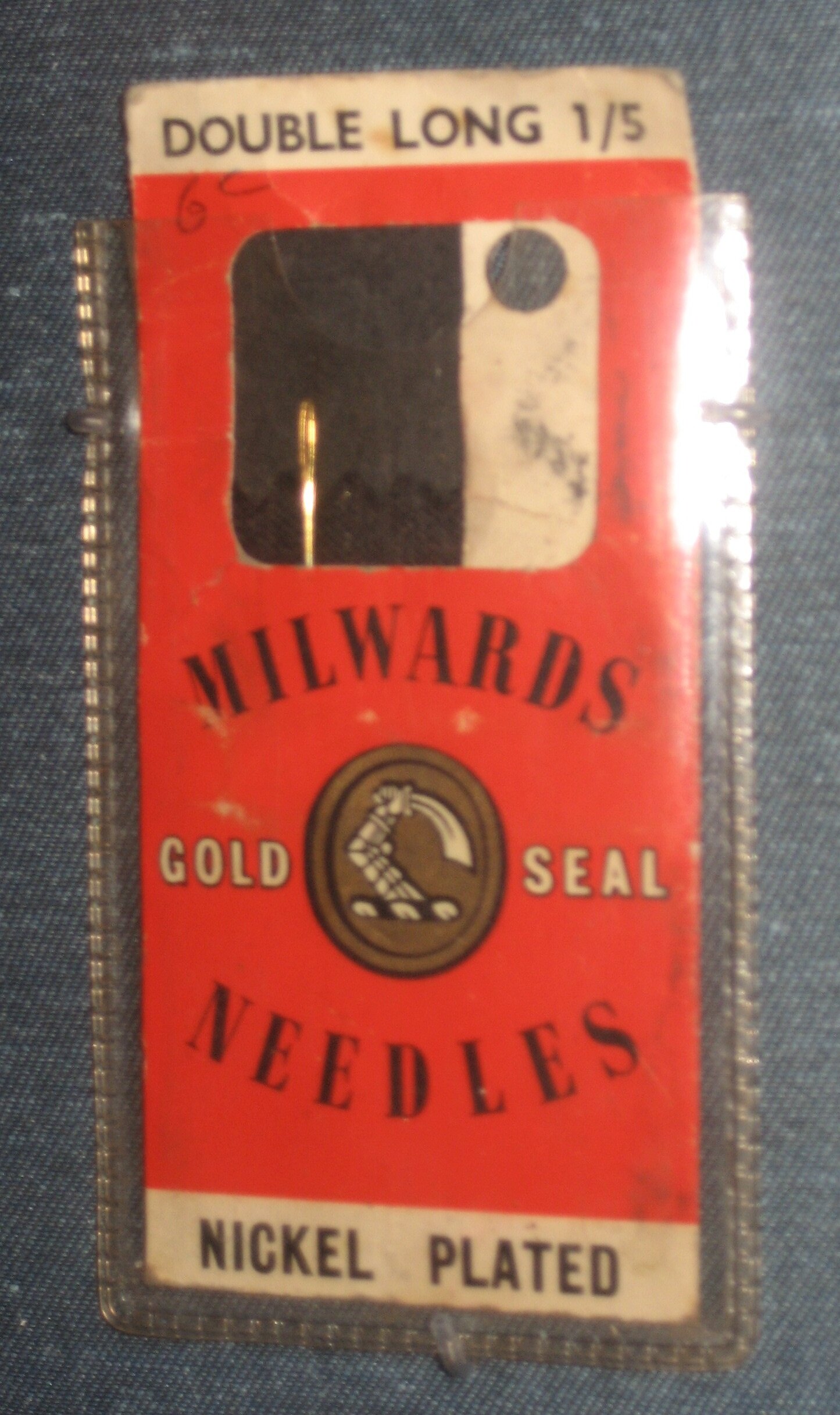 On front of packet: DOUBLE LONG 1/5/MILWARDS/GOLD SEAK/NEEDLES/NICKEL PLATED On back of packet: MILWARDS/GOLD SEAL/BEST QUALITY NEEDLES/MADE IN REDDITCH, ENGLAND