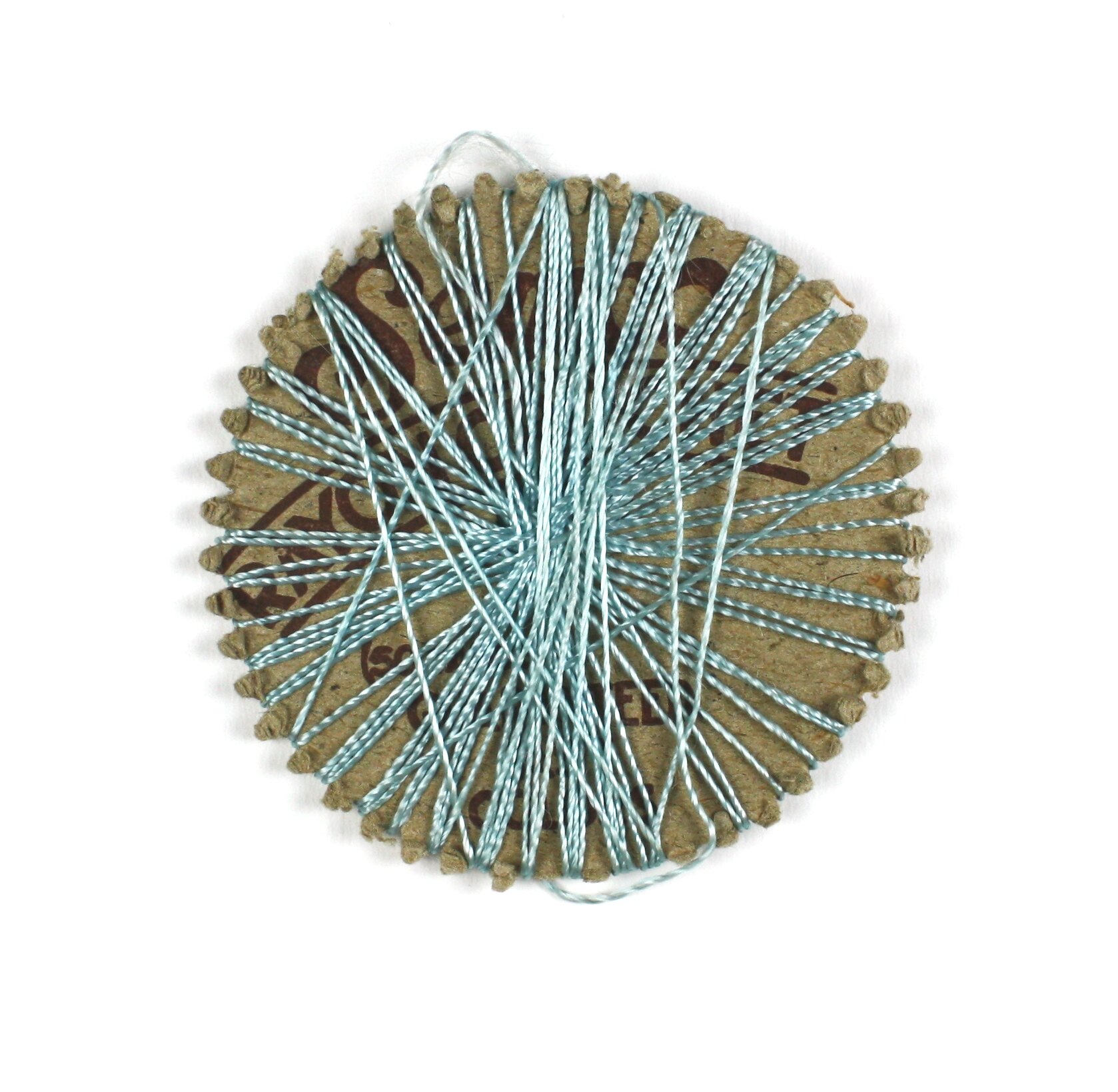 Blue rayon thread wound around round card, brand 'Semco Rayon Crochet. Guaranteed Fast Colours' 50 yards. Fastened on back with metal pin.