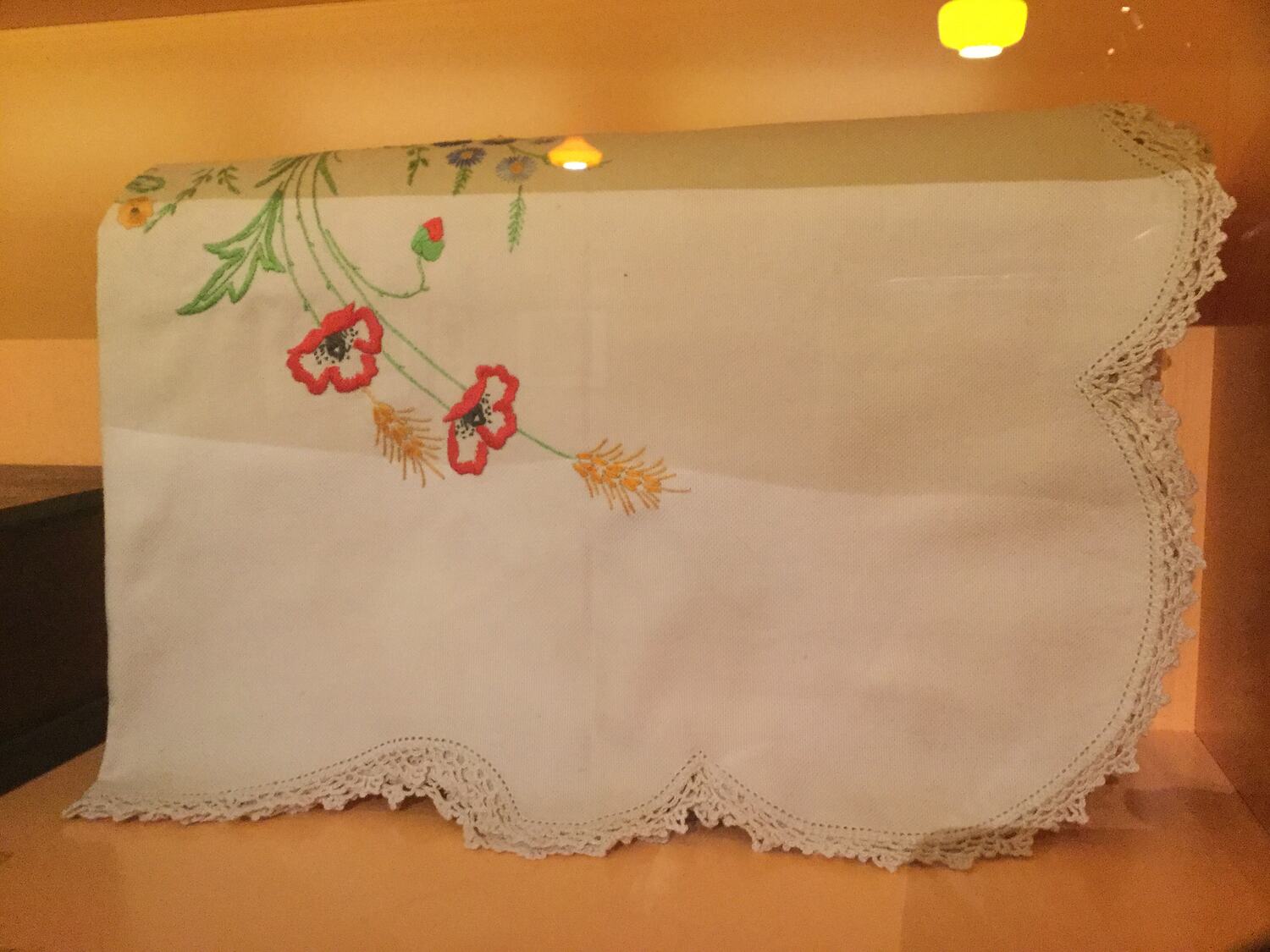 Supper cloth made by Kath Davis for her glory box during World War II and used in her married life. The coarse fabric demonstrates the scarcity of quality fabrics during the War which impacted upon the needlecraft women produced at this time.