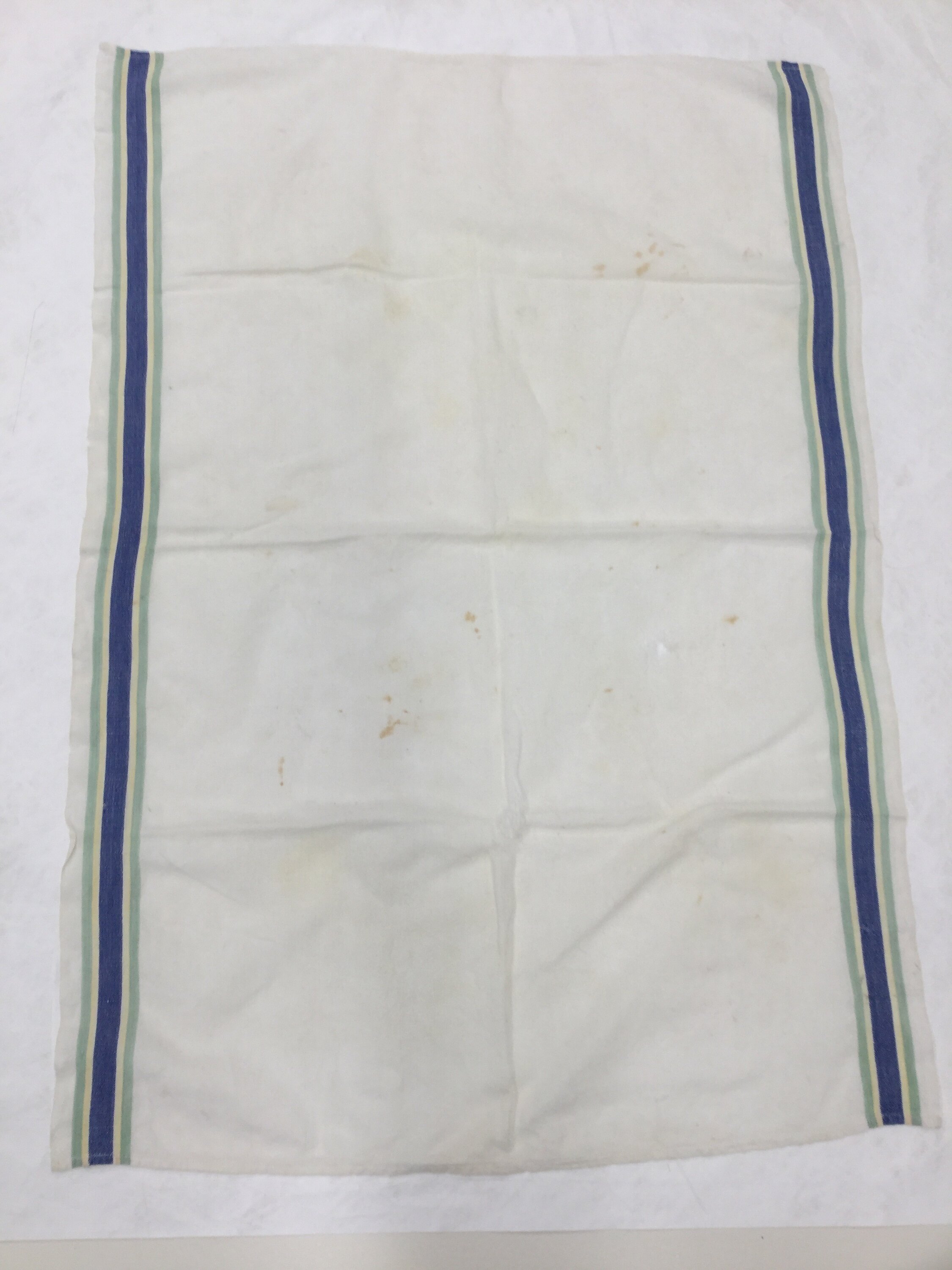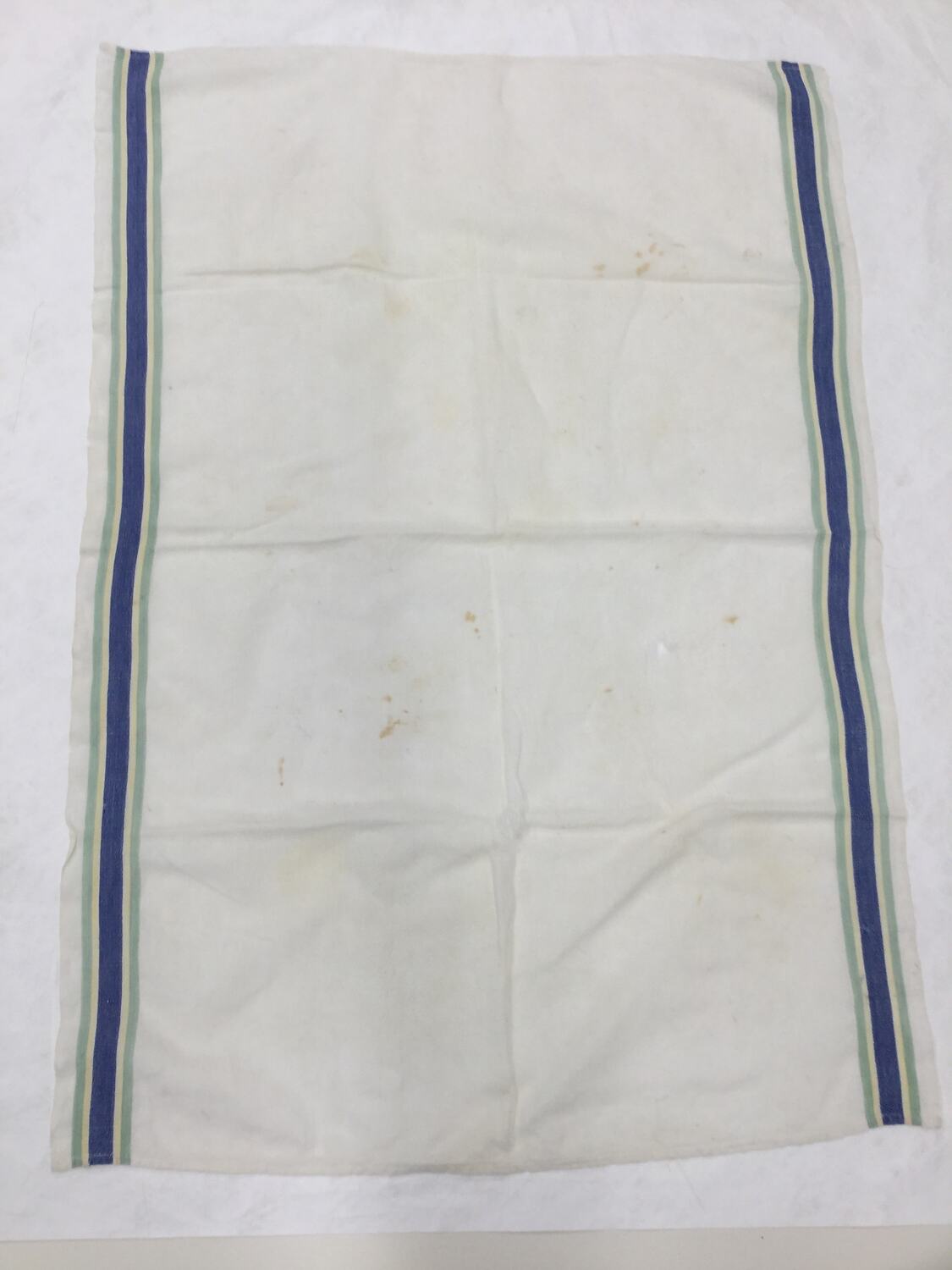Irish linen tea towel, white with blue, yellow and green striped edges down longest sides. Towel shows signs of wear and is torn in two places from use.