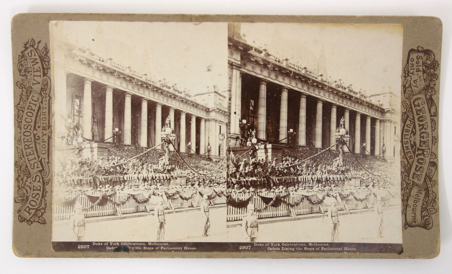 Stereograph depicting military cadets lining the steps of Parliament House, Melbourne, during celebrations for the visit of the Duke of York, 1901. Published by George Rose, Melbourne. It is part of a collection of Rose Stereoscopic views (stereographs) relating to the visit of the Duke and Duchess of Cornwall and York to Melbourne and Sydney during the celebrations for the Federation of Australia in 1901.