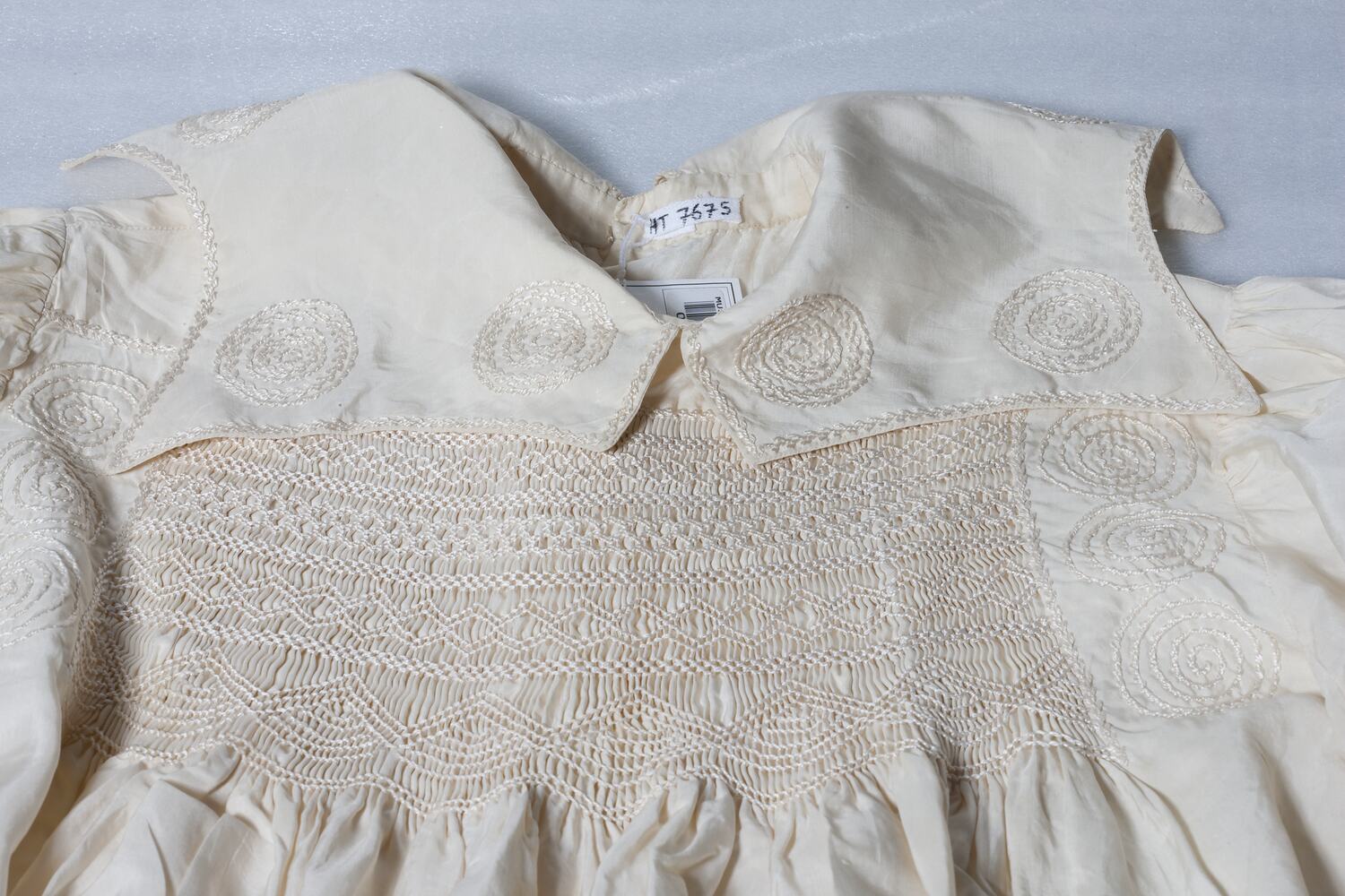 Cream, full-length, with long sleeves. Smocking across front and back yolks, with hand embroidered spirals on either side. Dress falls from slight gathering below smocking. Collar decorated with spirals and herringbone stitch along edge. Smocked cuffs. Metal press studs along back closure.