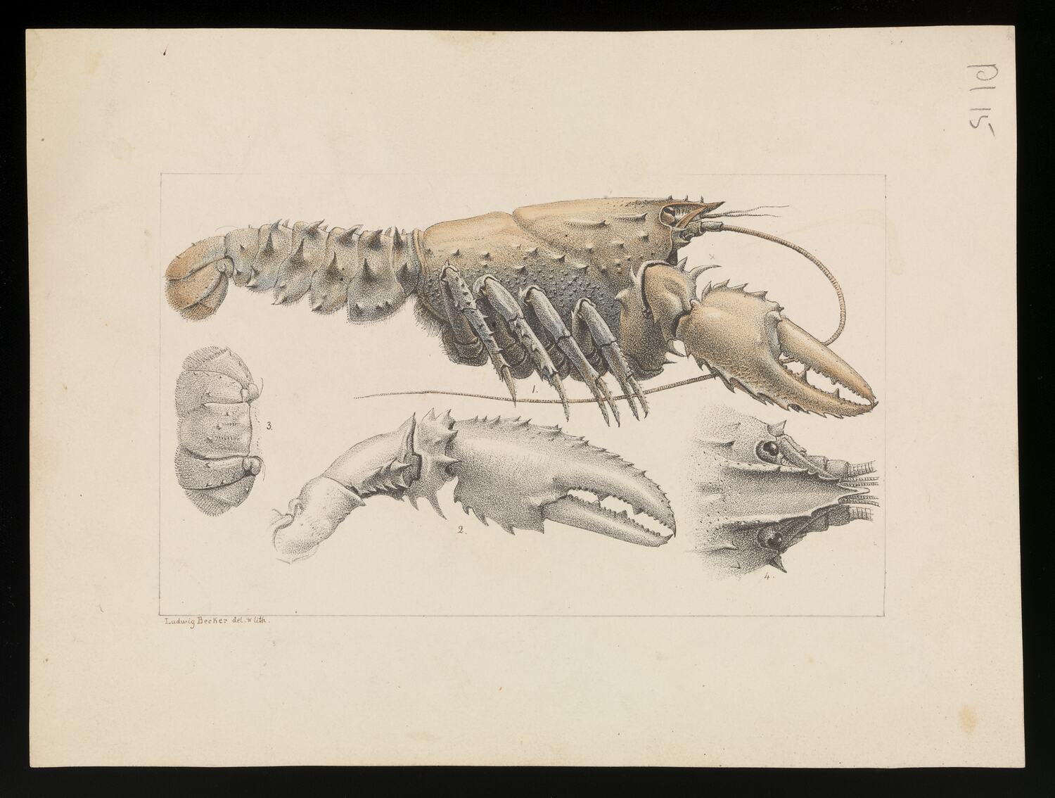 Murray Spiny Crayfish, Euastacus armatus by Ludwig Becker. Hand coloured proof, lithographic ink, watercolour, indian ink and pencil on paper, 19cm x 26cm. Published as Plate 15 in The Prodromus of the Zoology of Victoria by Frederick McCoy.