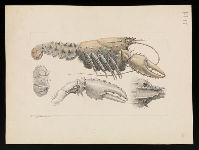 This hand coloured proof by Ludwig Becker was commissioned by Frederick McCoy, Director of Museum Victoria as part of his zoological research. It forms part of the much larger Prodromus Collection. Many of the original illustrations in the collection informed the production of the two volume work The Prodromus of the Zoology of Victoria which was Museum Victoria's first major publication from 1878. Accompanying the published plate was McCoy's description of where and how to catch the Murray Spiny Crayfish. "Very common in the Murray River, where it is caught by lowering a piece of bagging, with cords and floats to the four corners, with some flesh in the middle; this being pulled up every now and then shows three or four of the "Lobsters" feeding; a bit of meat at the end of a string suffices to catch them."