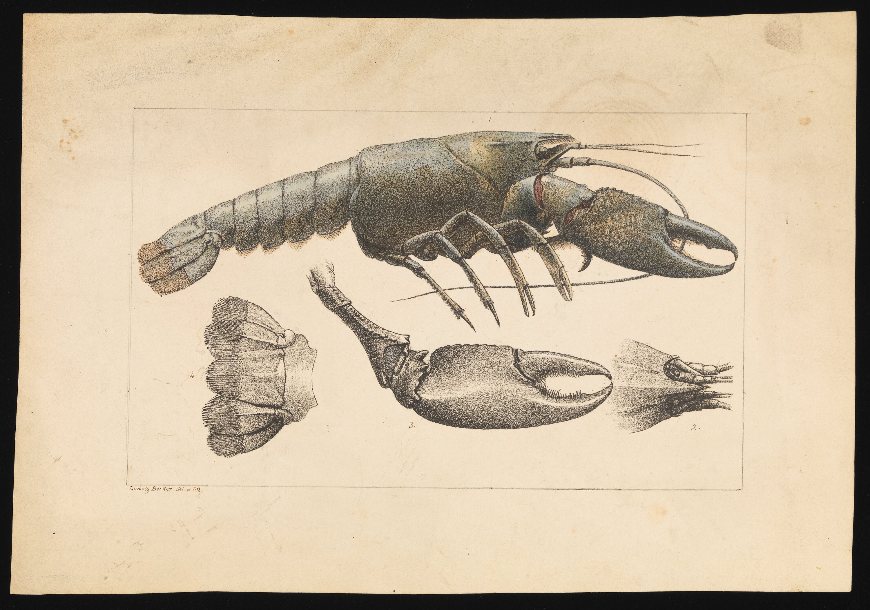 Hand coloured lithographic proof of a Yabby, Cherax destructor, by Ludwig Becker for Plate 29 in The Prodromus of the Zoology of Victoria by Frederick McCoy.