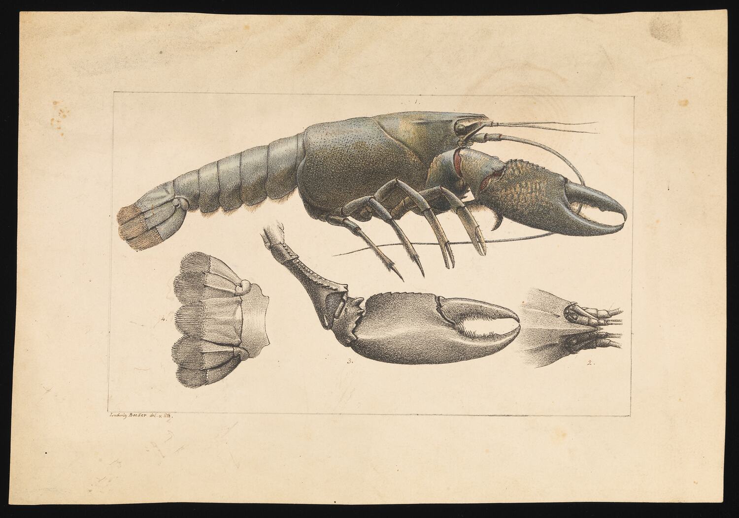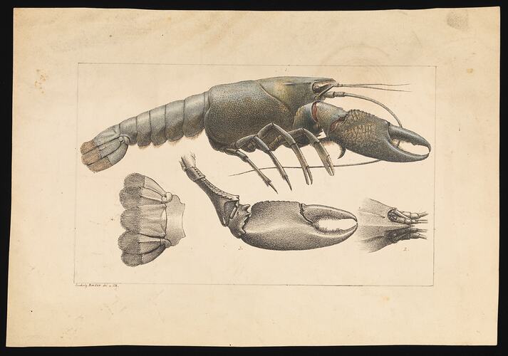 Yabby, Cherax destructor by Ludwig Becker. Hand coloured proof, lithographic ink, watercolour, indian ink and pencil on paper, 17cm x 25cm. Published as Plate 29 in The Prodromus of the Zoology of Victoria by Frederick McCoy.
