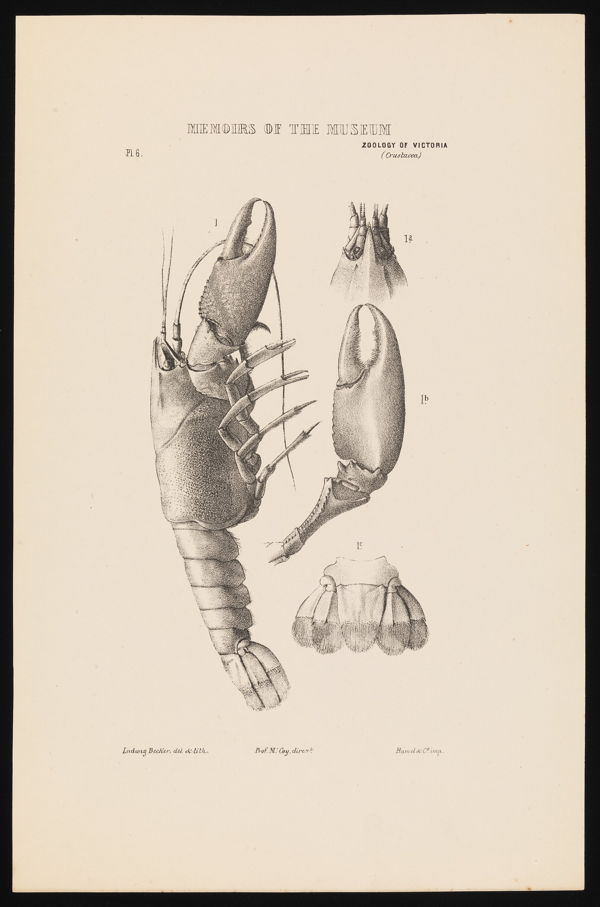 Yabby, Cherax destructor by Ludwig Becker. Single colour proof (black), lithographic ink on paper, 31cm x 20cm. Published as Plate 29 in The Prodromus of the Zoology of Victoria by Frederick McCoy.