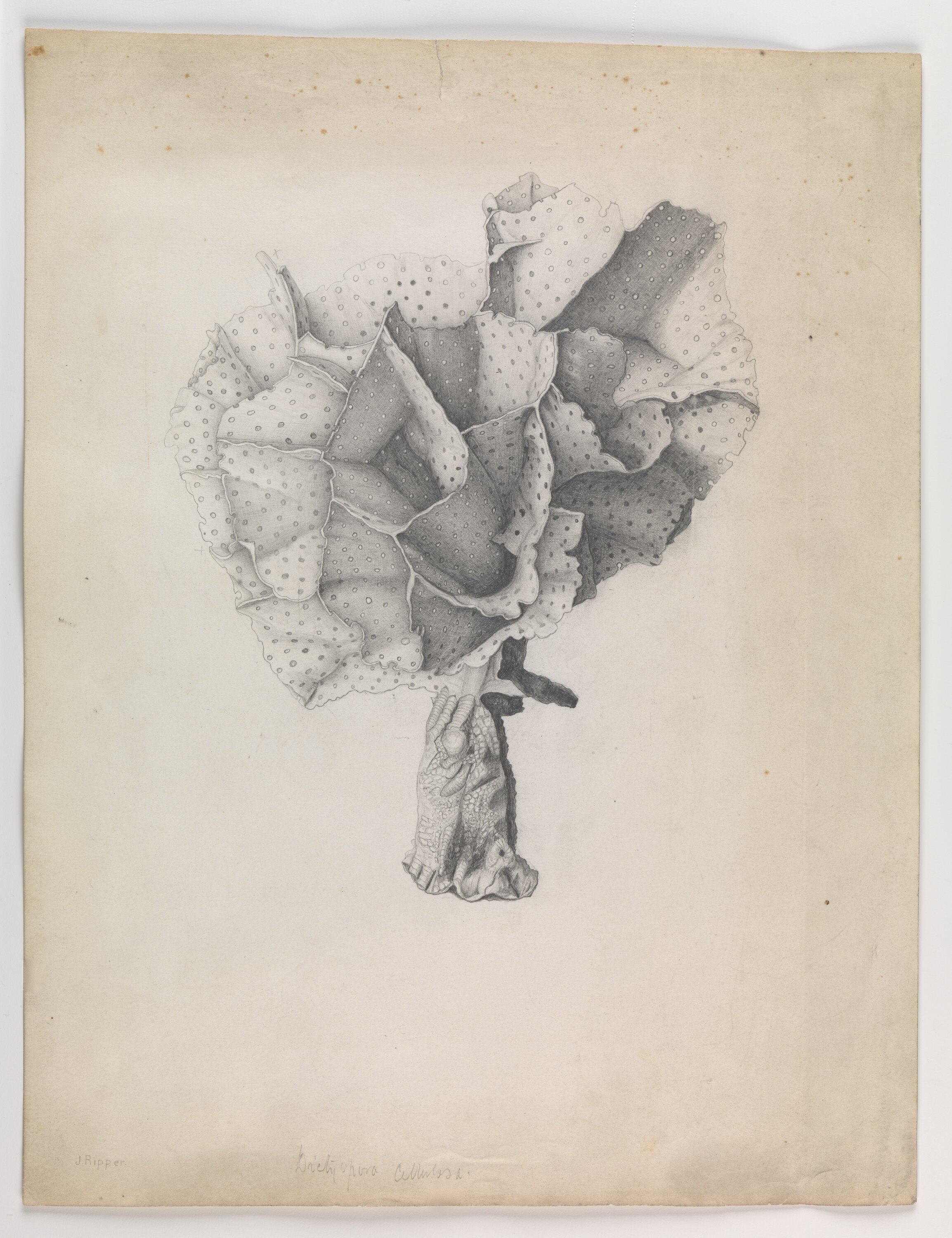 This scientific illustration by James Ripper of the bryozoan Adeona cellulosa from Queenscliff (named Dictyopora cellulosa in the Prodromus) was commissioned by Sir Frederick McCoy, Director of Museum Victoria as part of his zoological research. Bryozoa, often called lace corals, are often cryptic and appear dull-coloured to the naked eye, and their true beauty is often revealed through a microscope. McCoy treated some 300 bryozoan species in the Prodromus, and such illustrations showcase their delicate, fine and ornately-sculptured calcareous skeletons. This work is part of the much larger Prodromus Collection which includes approx. 1000 illustration of specimens from colonial Victoria. Many of the oriignal illustrations in the collection informed the production of the two volume work 'The Prodromus of the Zoology of Victoria' which was Museum Victoria's first major publication from 1878.