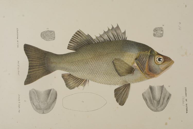 Estuary Perch, Macquaria colonorum by Arthur Bartholomew. Colour proof d, lithographic ink and pencil on paper, 29cm x 19cm. Published as Plate 14 in The Prodromus of the Zoology of Victoria by Frederick McCoy.