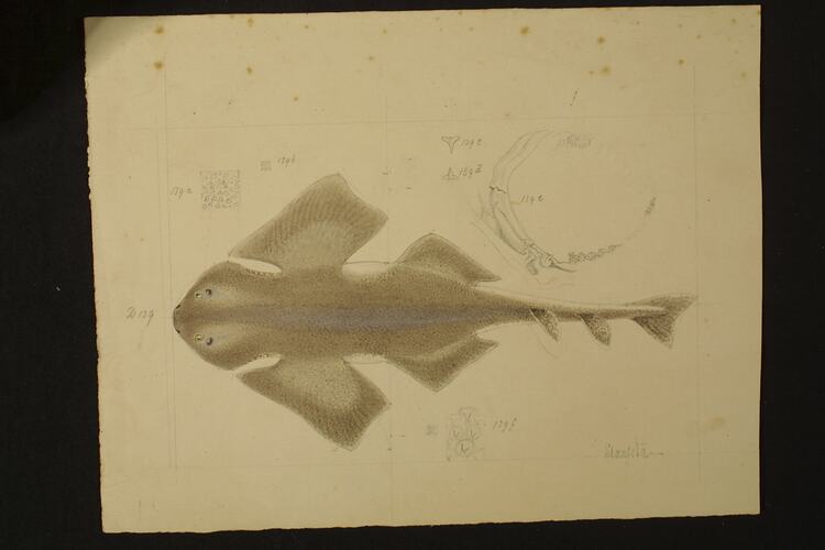 Watercolour and pencil drawing D139 of an Australian Angelshark, Squatina australis Regan, by Frederick Schoenfeld, finally published as Plate 34 in The Prodromus of the Zoology of Victoria by Frederick McCoy.