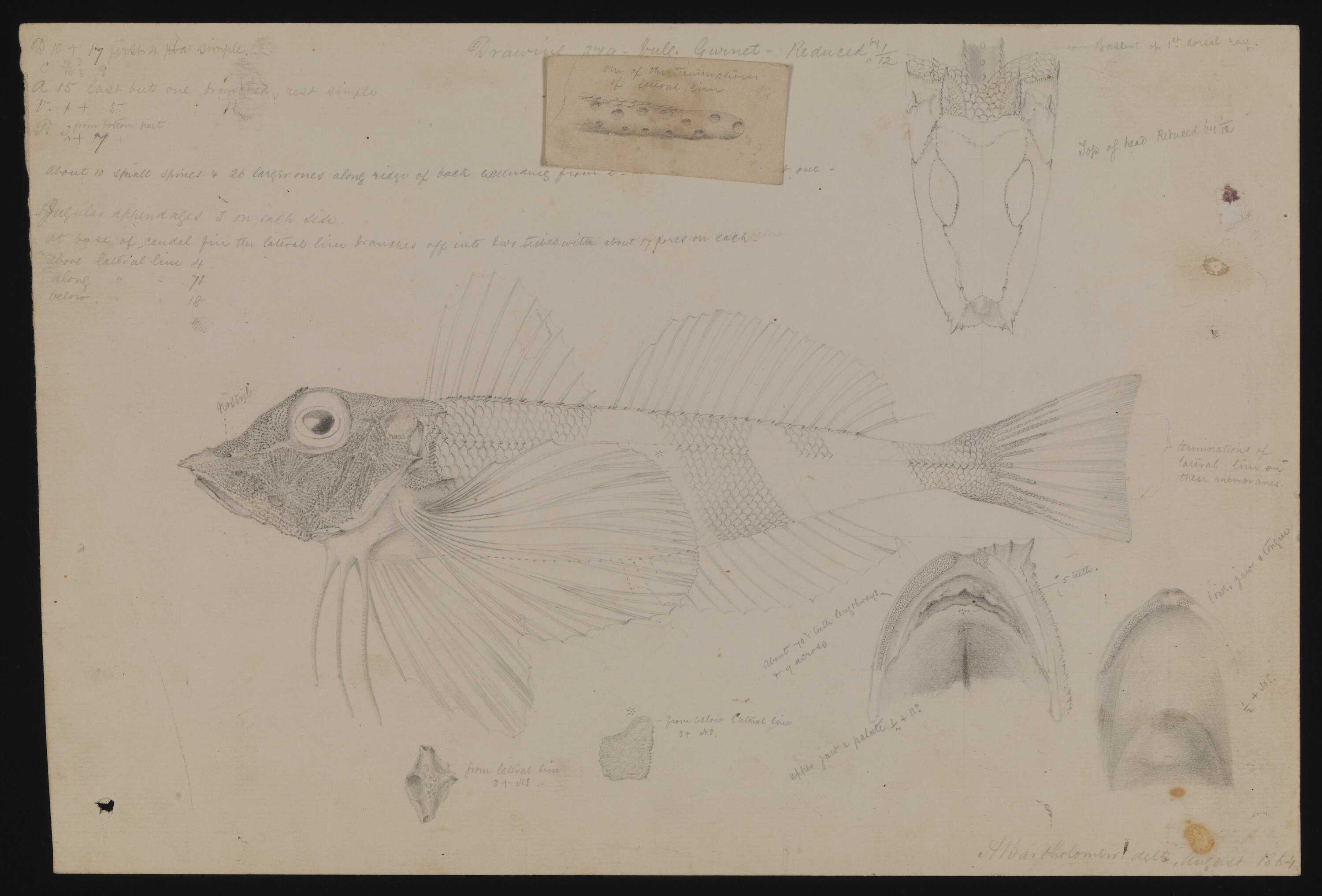 Pencil illustration (D379) of a Butterfly Gurnard, Lepidotrigla vanessa, by Arthur Bartholomew. This work was commissioned by Frederick McCoy, the first Director of The National Museum of Victoria, for Plate 5 in The Prodromus of the Zoology of Victoria; Figures and descriptions of the living species of all classes of the Victoria indigenous animals. Bartholomew's illustrations were based on a specimen from Hobsons Bay, Port Phillip, August 1864, now registered as NMV 41545 in Museum's Ichthyology Collection.