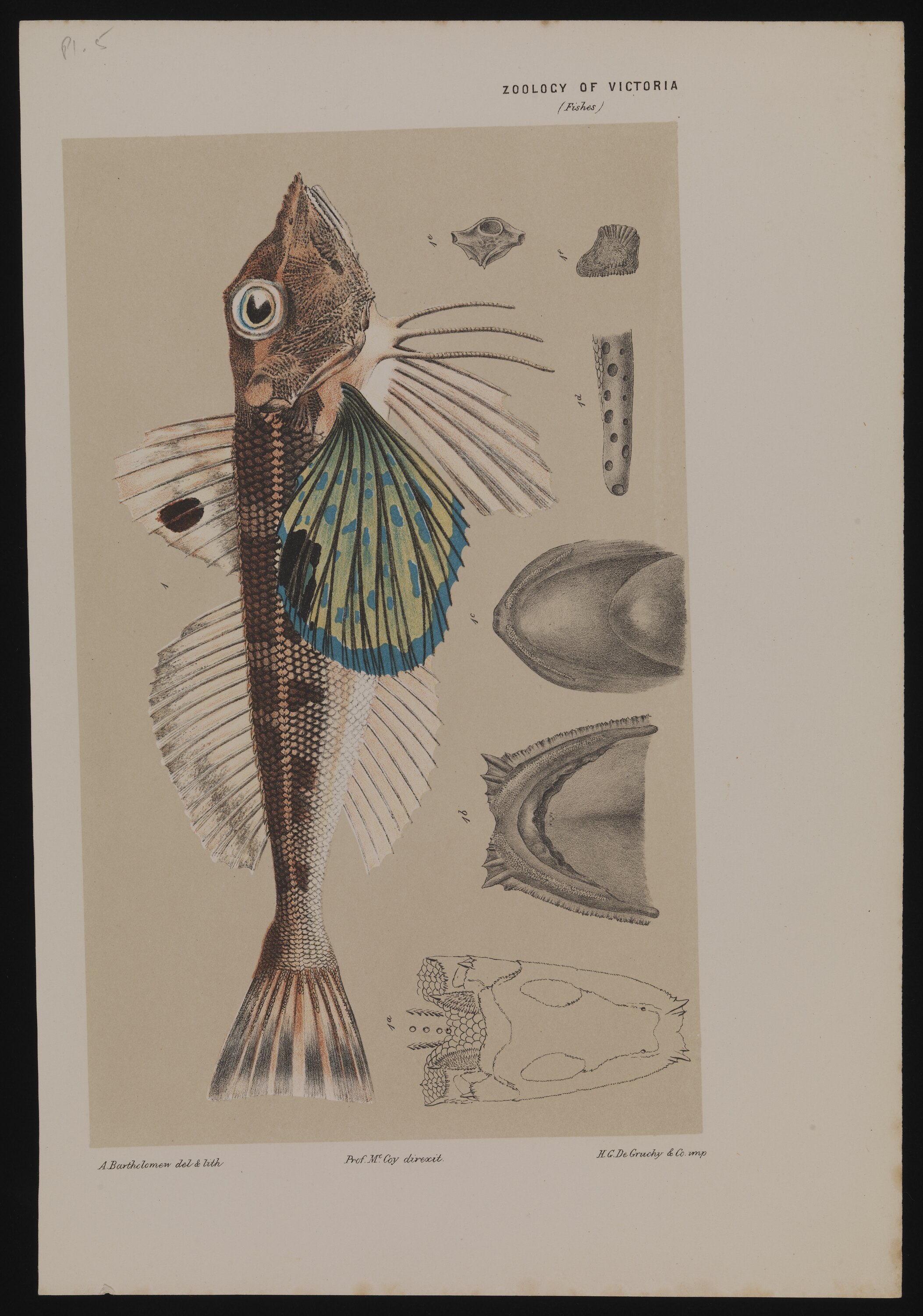 Full colour proof of a Butterfly Gurnard, Lepidotrigla vanessa, with Arthur Bartholomew as both artist and lithographer. This work was commissioned by Frederick McCoy, the first Director of The National Museum of Victoria, for Plate 5 in 'The Prodromus of the Zoology of Victoria; Figures and descriptions of the living species of all classes of the Victoria indigenous animals'. Bartholomew's illustrations were based on a specimen from Hobsons Bay, Port Phillip, August 1864, now registered as NMV 41545 in Museum's Ichthyology Collection.
