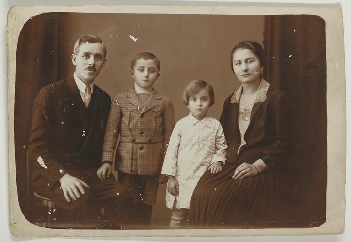 Family portrait of a family of four, two adults and two young children. Both of the adults are seated and the little girl stands by her mother and the boy by his father. The photograph is of Julius Toth's Grandfather's bother and his family, taken in Nagyvarad, Hungary (now known as Oradea, Romania) in 1910.