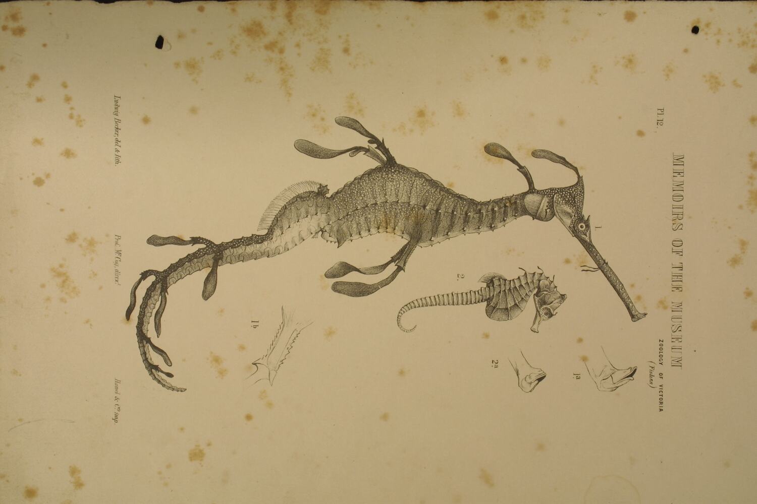 Common Seadragon/Shorthead Seahorse, Phyllopteryx taeniolatus/Hippocampus breviceps, by Ludwig Becker. Single colour proof (black), lithographic ink on paper, 20cm x 30cm. Published as Plate 65 in The Prodromus of the Zoology of Victoria by Frederick McCoy.