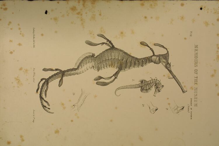 Lithographic proof (single colour black) of a Common Seadragon, Phyllopteryx taeniolatus, and a Shorthead Seahorse, Hippocampus breviceps, by Ludwig Becker. This work was finally published as Plate 65 in the Prodromus of the Zoology of Victoria by Frederick McCoy.