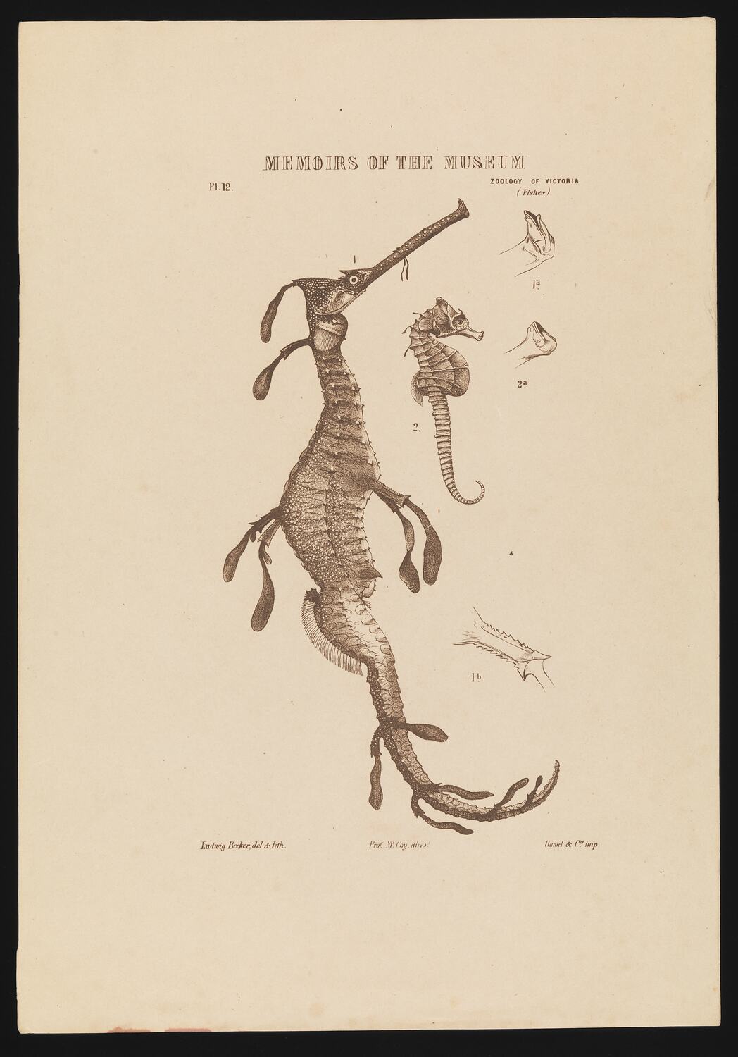 Lithographic proof (single colour brown) of a Common Seadragon, Phyllopteryx taeniolatus, and a Shorthead Seahorse, Hippocampus breviceps, by Ludwig Becker. This work was published as Plate 65 in the Prodromus of the Zoology of Victoria by Frederick McCoy.
