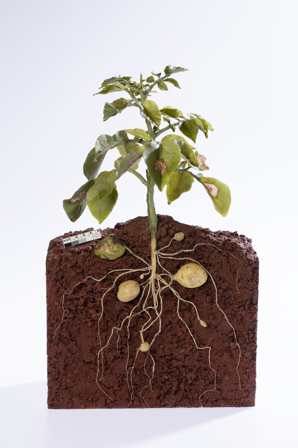 Model of a potato plant including the root system. The stem of the plant above ground has a break in it. The stems and leaves are damaged due to potato moth larvae.