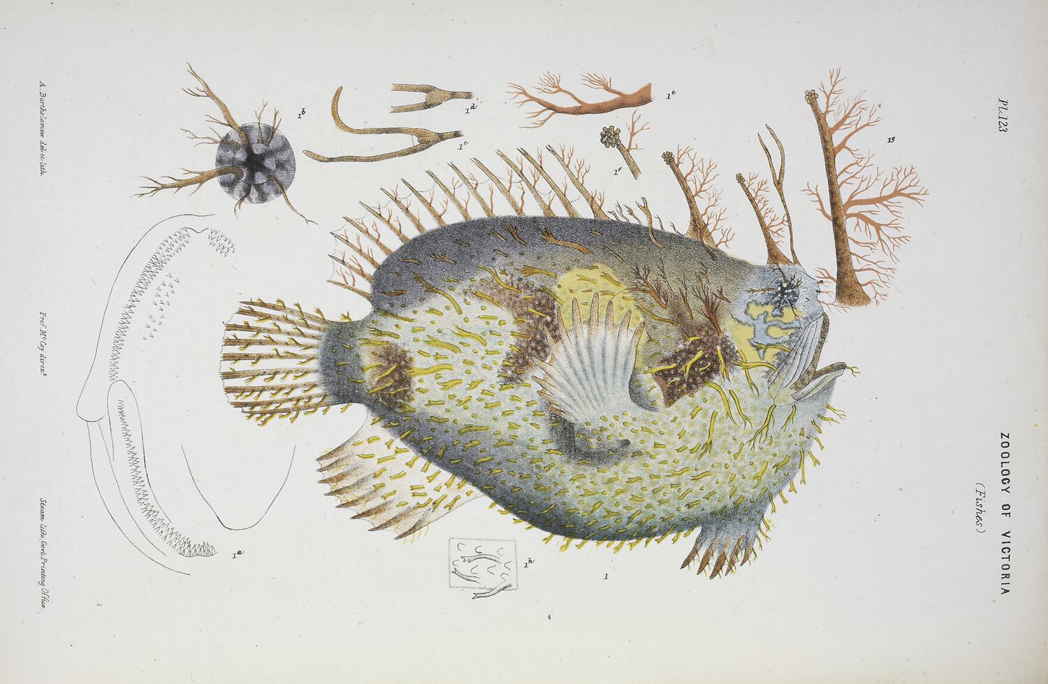 Tasselled Anglerfish, Rhycherus filamentosus (Castelnau, 1872) by Arthur Bartholomew. Colour proof b, lithographic ink on paper, 28cm x 19cm. Published as Plate 123 in The Prodromus of the Zoology of Victoria by Frederick McCoy.
