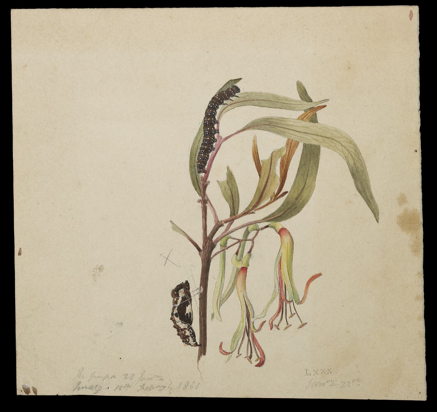 Watercolour illustration of the larva, pupa and host plant of the Red-spotted Jezebel Butterfly, Delias aganippe, by Arthur Bartholomew, 1861. This work was commissioned by Frederick McCoy, the first Director of The National Museum of Victoria, for Plate 10 in The Prodromus of the Zoology of Victoria; Figures and descriptions of the living species of all classes of the Victoria indigenous animals. McCoy referred to this species as Pieris (Thyca) aganippe, and noted that the larvae feed on the leaves of Loranthus, the Native Mistletoe. Bartholomew's illustration differs slightly from the published version.