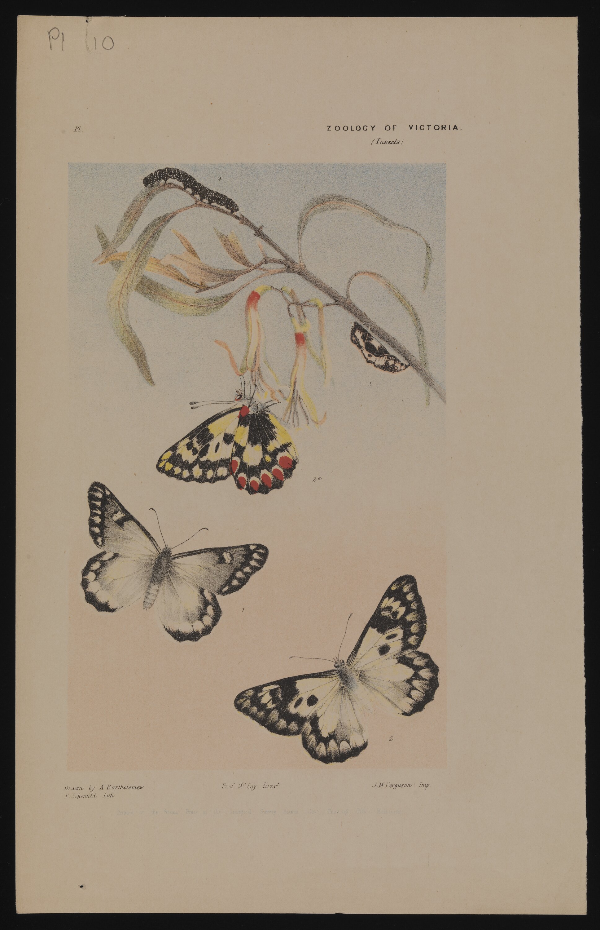 Colour proof of the life stages and host plant of the Red-spotted Jezebel Butterfly, Delias aganippe, illustrated by Arthur Bartholomew, with Frederick Schoenfeld as lithographer. This work was commissioned by Frederick McCoy, the first Director of The National Museum of Victoria, for Plate 10 in The Prodromus of the Zoology of Victoria; Figures and descriptions of the living species of all classes of the Victoria indigenous animals. McCoy referred to this species as Pieris (Thyca) aganippe, noting that the larvae feed on the leaves of Loranthus, the 'Native Mistletoe'.
