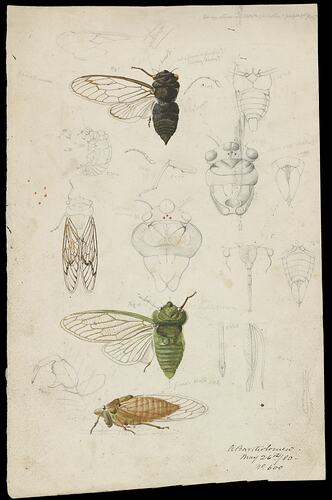 Watercolour and pencil illustration (D600) of male and female Redeye Cicada, Psaltoda moerens and Greengrocer, Cyclochila australasiae, by Arthur Bartholomew, 26 May 1880. This work was commissioned by Frederick McCoy, the first Director of The National Museum of Victoria, for Plate 50 in The Prodromus of the Zoology of Victoria; Figures and descriptions of the living species of all classes of the Victoria indigenous animals. McCoy originally referred to these species as Cicada moerens, The Great Black, or Manna Cicada, and Cyclochila australasiae, The Great Green Cicada.