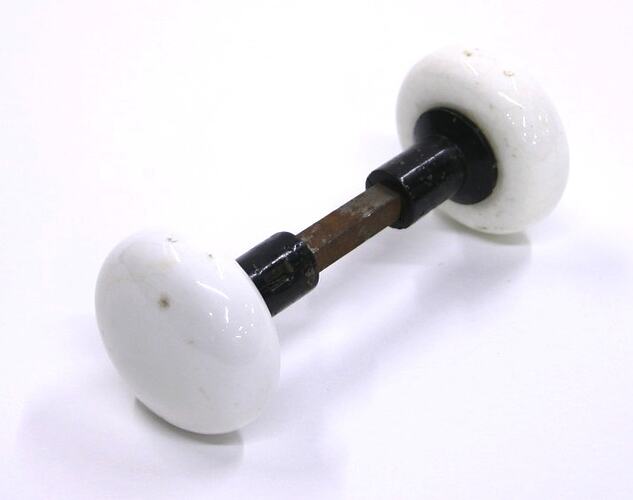Doorknob comprising two round, white ceramic handles joined together by a square, metal axle.