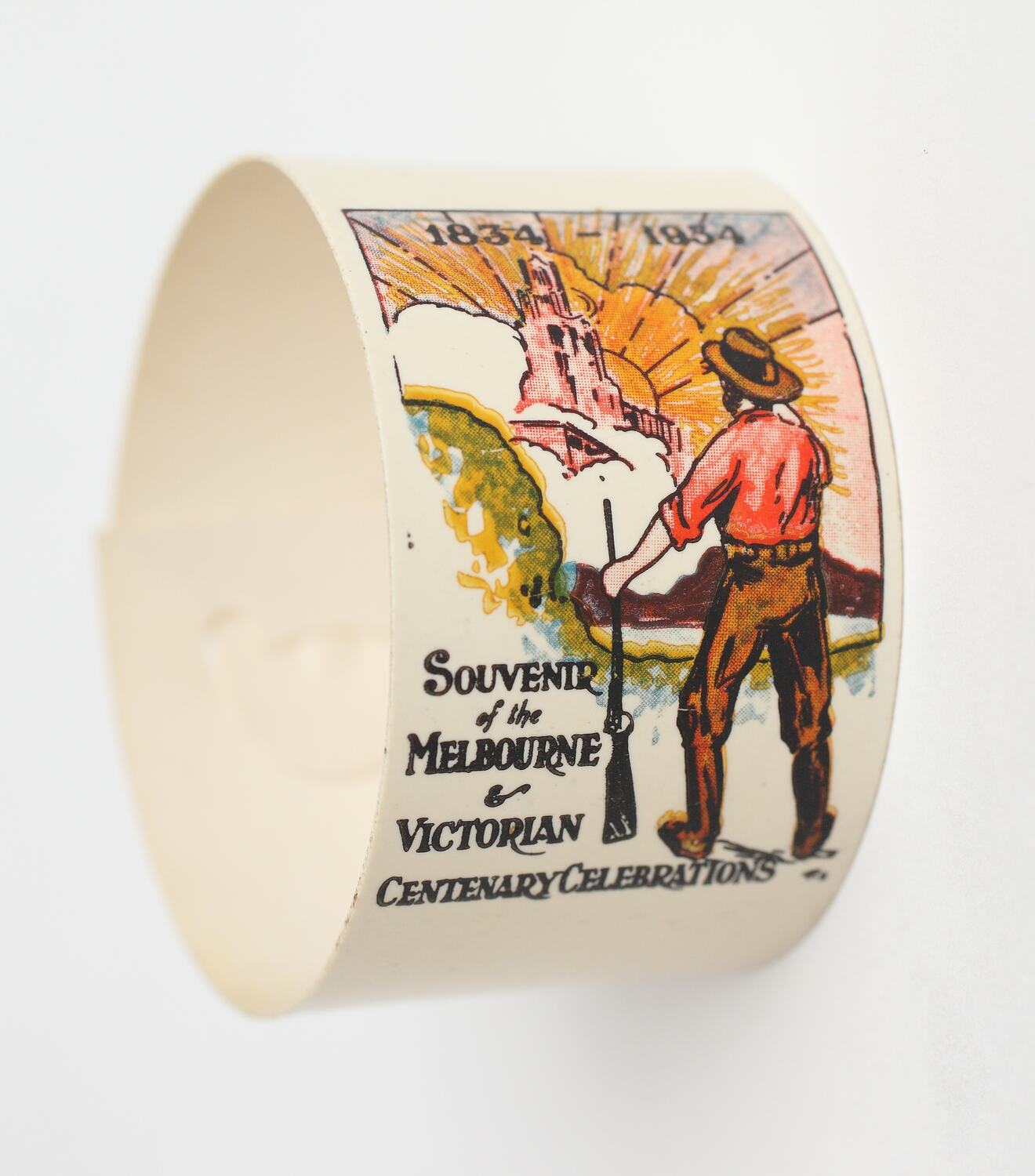 Serviette ring made of a strip of celluloid that can be slotted together to make a circuit. The serviette ring was produced as a souvenir for the Melbourne & Victorian Centenary Celebrations of 1934 -35. It shows John Batman gazing in wonder at the great city that has risen since its founding 100 years ago. Elevated to heroic status, Batman was reinvented as a courageous pioneer whose life exemplified the rewards of self-improvement.