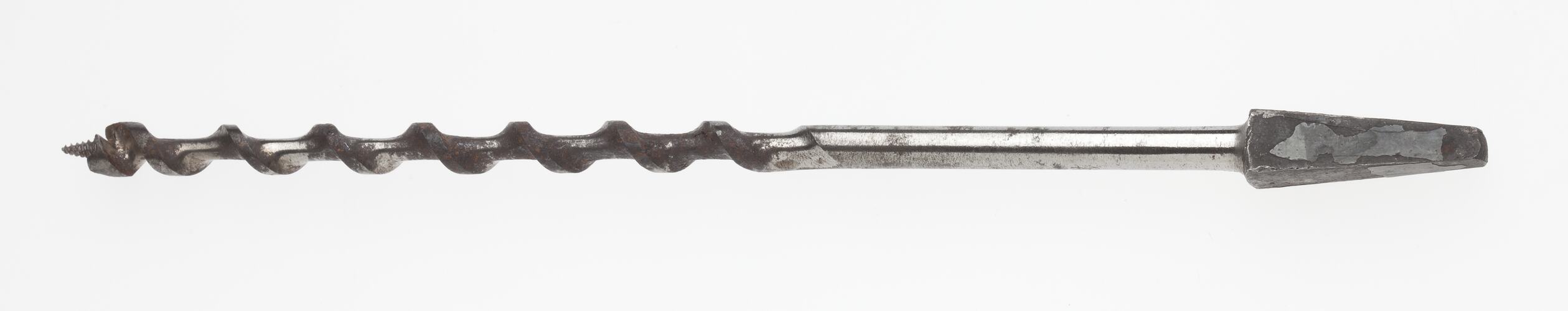 Long metal drill bit with spiral grooves along most of its length.