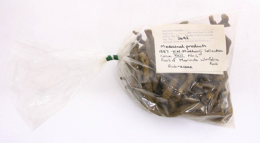 Handwritten on paper tag inside bag: "Medicinal products / 1887 T.N. Mukharji Collection / Case XXII No 6 / Root of Morinda Citrifolia / Rubiaceae / Roxb"