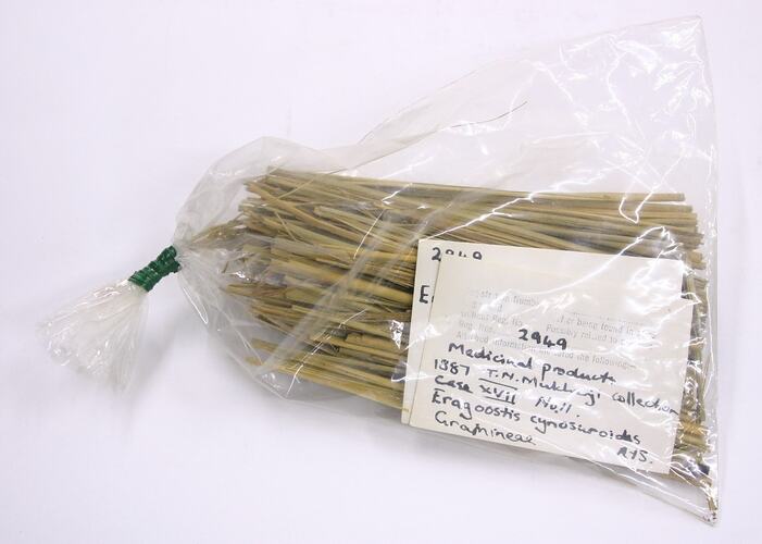 Bundle of dried grass stems, pale yellow tinged with green in colour, housed in a plastic bag. A museum label is included in the bag on whic the specimen details are handwritten in black ink.
