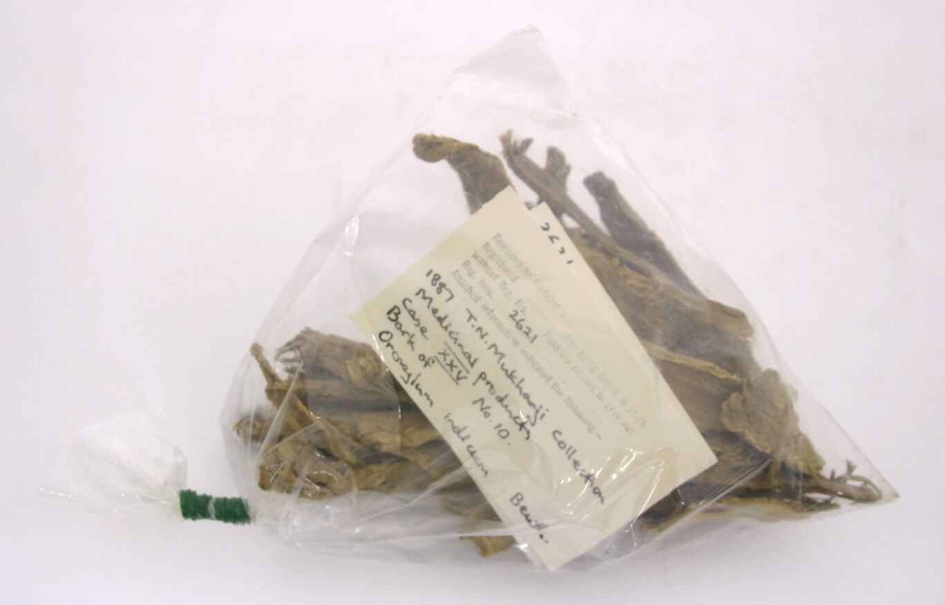 Sample of Oroxylum indicum (Bignoniaceae) bark. This was collected and prepared by T.N.Mukharji as part of his work for the Indian Botanical Gardens. It was donated to the Museum by the Indian Government, Calcutta in 1887.