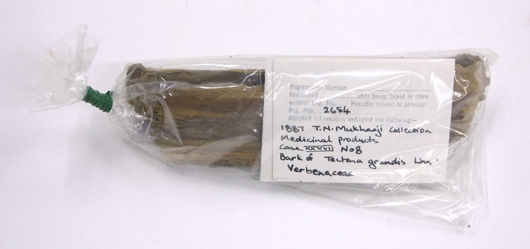 Handwritten on paper tag inside bag: "1887 T.N. Mukharji Collection / Medicinal products / Case XXXVII No 8 / Bark of Tectona Grandis Linn / Verbenaceae"