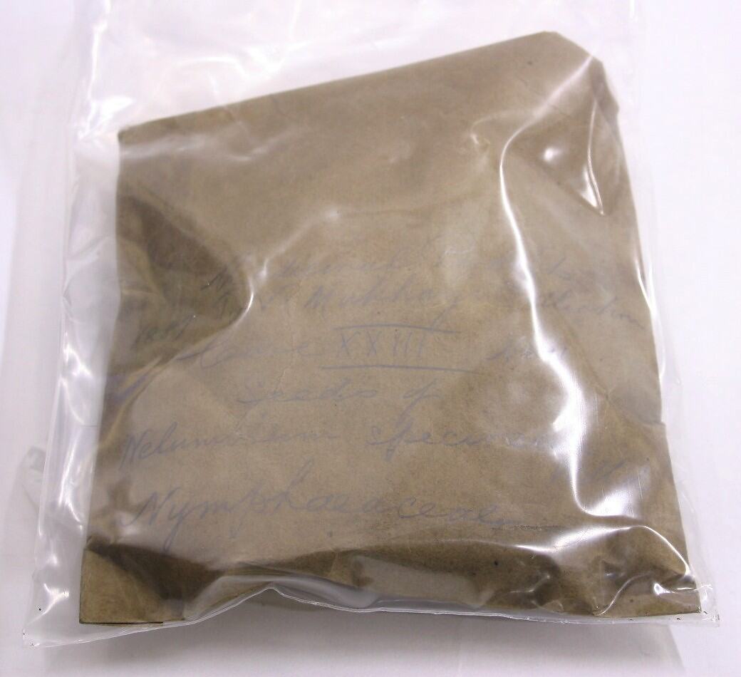 A sample of the Nelumbium Speciosum (Nymphaeaceae) wild [Lotus] seeds, packaged in brown paper, with handwritten text on the front. Package is sealed in a clear plastic bag.