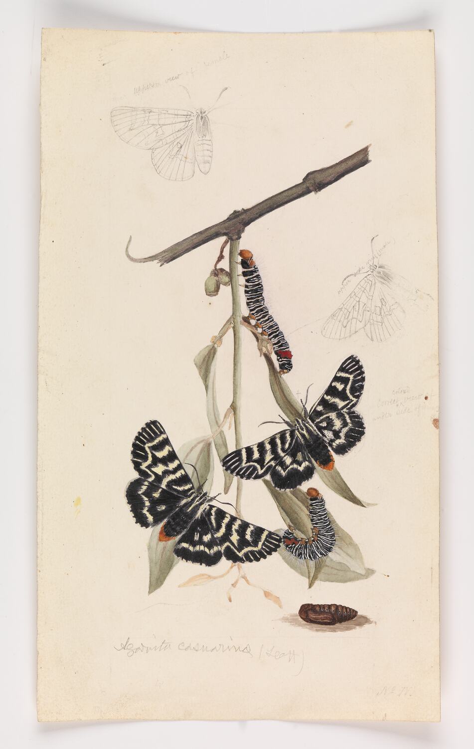Watercolour and pencil illustration (D4) of the life stages of a Mistletoe Moth, Comocrus behri, by Arthur Bartholomew in 1865. This work was commissioned by Frederick McCoy, the first Director of The National Museum of Victoria, for Plate 8 in 'The Prodromus of the Zoology of Victoria; Figures and descriptions of the living species of all classes of the Victoria indigenous animals'. McCoy referred to this species as Agaristes casuarinae, The Loranthus Day-moth.