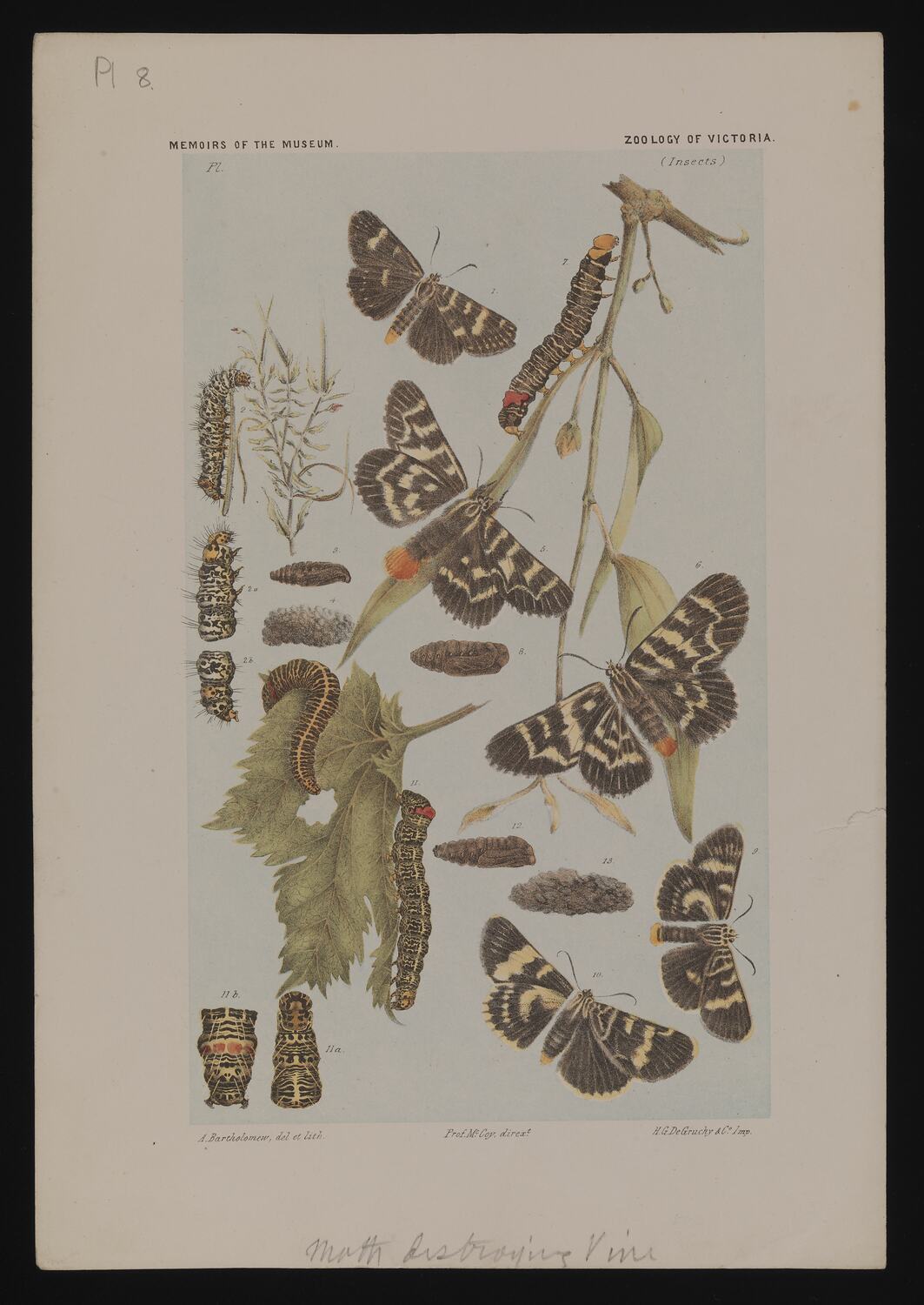 Full colour proof by Arthur Bartholomew (as both artist and lithographer), depicting the life stages and host plants of three moth species: the Owlet Moth (Phalaenoides tristifica), the Mistletoe Moth (Comocrus behri), and the Grapevine Moth (Phalaenoides glycinaei). This work was commissioned by Frederick McCoy, the first Director of The National Museum of Victoria, for Plate 8 in 'The Prodromus of the Zoology of Victoria; Figures and descriptions of the living species of all classes of the Victoria indigenous animals'. McCoy referred to these species as: Agarista lewin, Lewin's Day-moth (Figs 1-4); Agaristes casuarinae, The Loranthus Day-moth (Figs 5-8); and Agaristes glycine, The Vine Day-moth (Figs 9-13).