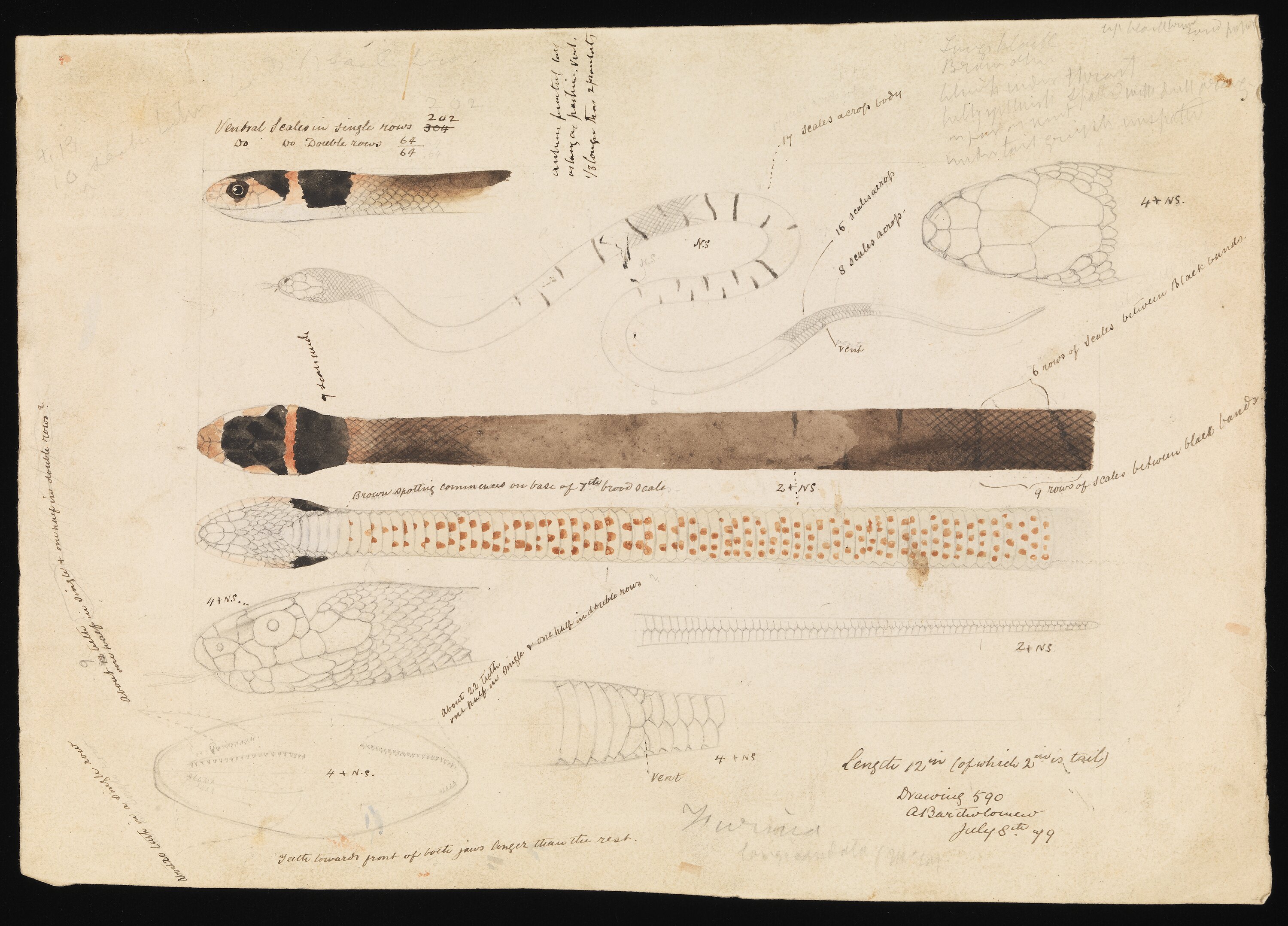 Pencil, watercolour and Indian ink illustration (D590) of a juvenile Eastern Brown Snake, Pseudechis textilis, from Longwood, Victoria, by Arthur Bartholomew, 8 July 1879. This work was commissioned by Frederick McCoy, the first Director of The National Museum of Victoria, for Plate 32 in The Prodromus of the Zoology of Victoria; Figures and descriptions of the living species of all classes of the Victoria indigenous animals.