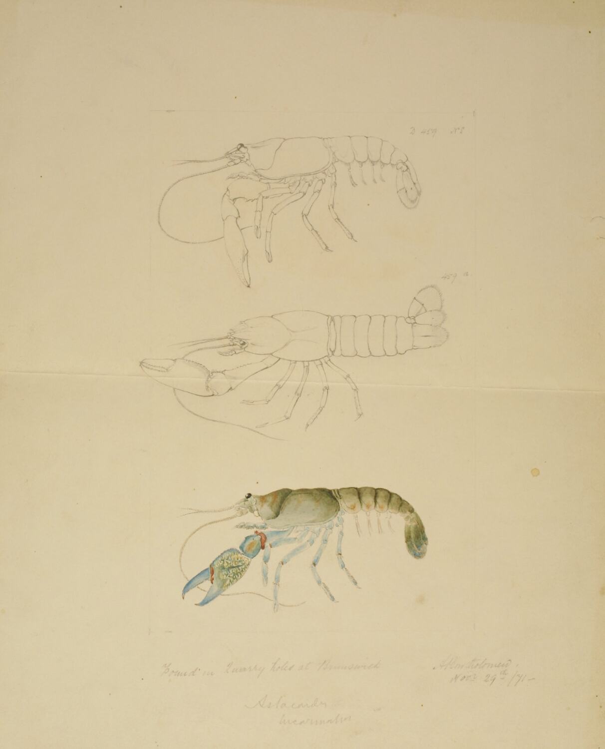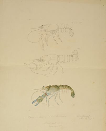 Watercolour, pencil and ink illustration, 459, of a Yabby, Cherax destructor, by Arthur Bartholomew, 29 November 1871, commissioned by Frederick McCoy for his zoological research. Bartholomew described this work as "Colored sketch from an older specimen".