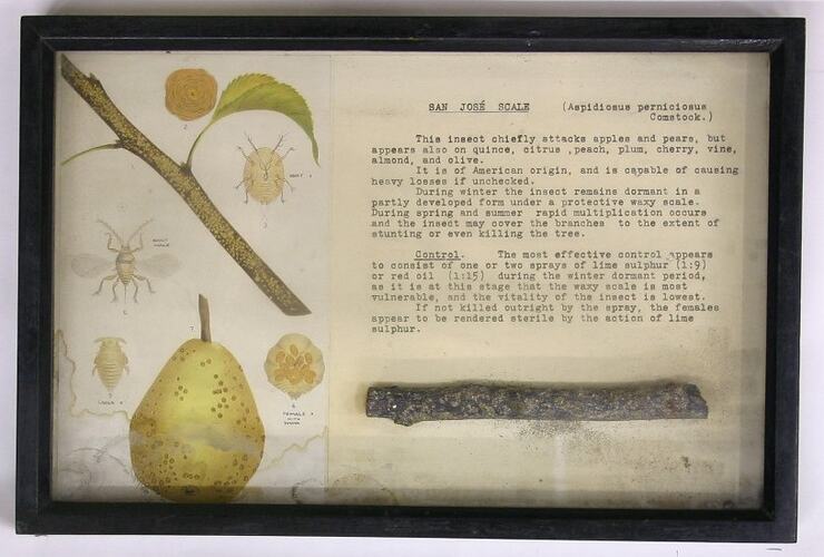 Boxed botanical display, containing information and an illustration of San Jose Scale (Aspidiosus perniciosus Comstock.). One in a series concerning botanical pests displayed in the old Museum. These were prepared by Elizabeth Matheson whom worked in the Entomolgy Department to illustrate the destructive insects of Victoria and how to expel and treat them. For her displays Elizabeth reproduced C.C Brittlebanks coloured plates from the book 'A Handbook of the Destructive Insects of Victoria; Prepared by Order of the Victorian Department of Agriculture by C French, Government Entomologist in 1904.