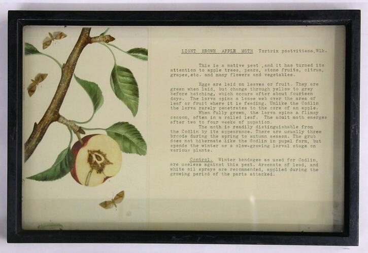 Boxed botanical display, containing information and an illustration of Light Brown Apple Moth (Tortrix postvittana, Wlk.). One in a series concerning botanical pests displayed in the old Museum. These were prepared by Elizabeth Matheson whom worked in the Entomolgy Department to illustrate the destructive insects of Victoria and how to expel and treat them. For her displays Elizabeth reproduced C.C Brittlebanks coloured plates from the book 'A Handbook of the Destructive Insects of Victoria; Prepared by Order of the Victorian Department of Agriculture by C French, Government Entomologist in 1904.