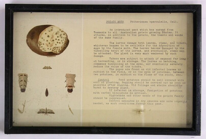 Boxed botanical display, containing information and an illustration of Potato Moth (Phthorimaea operculella, Zell.). One in a series concerning botanical pests displayed in the old Museum. These were prepared by Elizabeth Matheson whom worked in the Entomolgy Department to illustrate the destructive insects of Victoria and how to expel and treat them. For her displays Elizabeth reproduced C.C Brittlebanks coloured plates from the book 'A Handbook of the Destructive Insects of Victoria; Prepared by Order of the Victorian Department of Agriculture by C French, Government Entomologist in 1904.