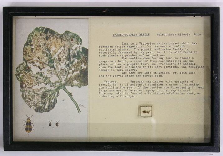Boxed botanical display, containing information and an illustration of the Banded Pumpkin Beetle (Aulacophora hilaris, Bois.). One in a series concerning botanical pests displayed in the old Museum. These were prepared by Elizabeth Matheson whom worked in the Entomolgy Department to illustrate the destructive insects of Victoria and how to expel and treat them. For her displays Elizabeth reproduced C.C Brittlebanks coloured plates from the book 'A Handbook of the Destructive Insects of Victoria; Prepared by Order of the Victorian Department of Agriculture by C French, Government Entomologist in 1904.