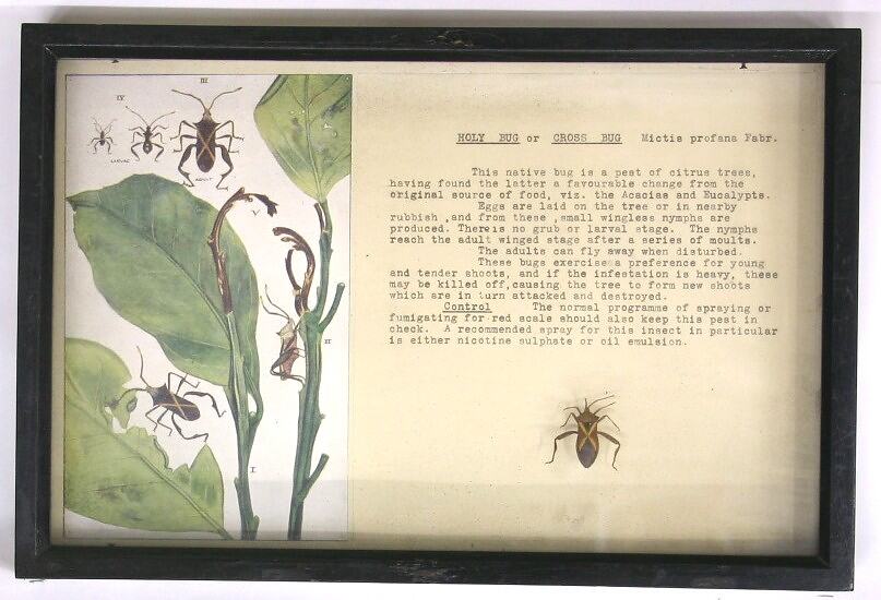 Boxed botanical display, containing information and an illustration of Holy Bug or Cross Bug (Mictis profana Fabr.). One in a series concerning botanical pests displayed in the old Museum. These were prepared by Elizabeth Matheson whom worked in the Entomolgy Department to illustrate the destructive insects of Victoria and how to expel and treat them. For her displays Elizabeth reproduced C.C Brittlebanks coloured plates from the book 'A Handbook of the Destructive Insects of Victoria; Prepared by Order of the Victorian Department of Agriculture by C French, Government Entomologist in 1904.