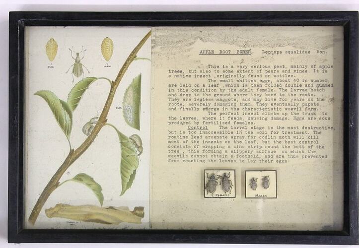 Boxed botanical display, containing information and an illustration of the Apple Root Borer (Leptops squalidus Bon.). One in a series concerning botanical pests displayed in the old Museum. These were prepared by Elizabeth Matheson whom worked in the Entomolgy Department to illustrate the destructive insects of Victoria and how to expel and treat them. For her displays Elizabeth reproduced C.C Brittlebanks coloured plates from the book 'A Handbook of the Destructive Insects of Victoria; Prepared by Order of the Victorian Department of Agriculture by C French, Government Entomologist in 1904.