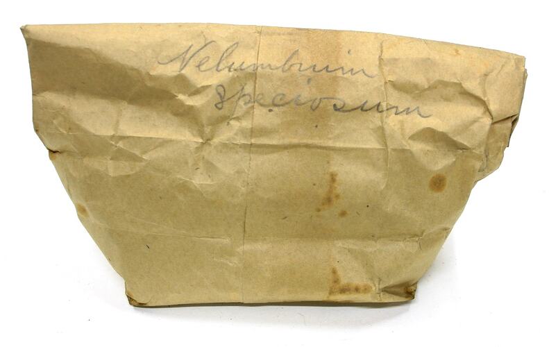 Numerous oval, dark brown seeds contained in a paper bag with handwriting in lead pencil on the outside.