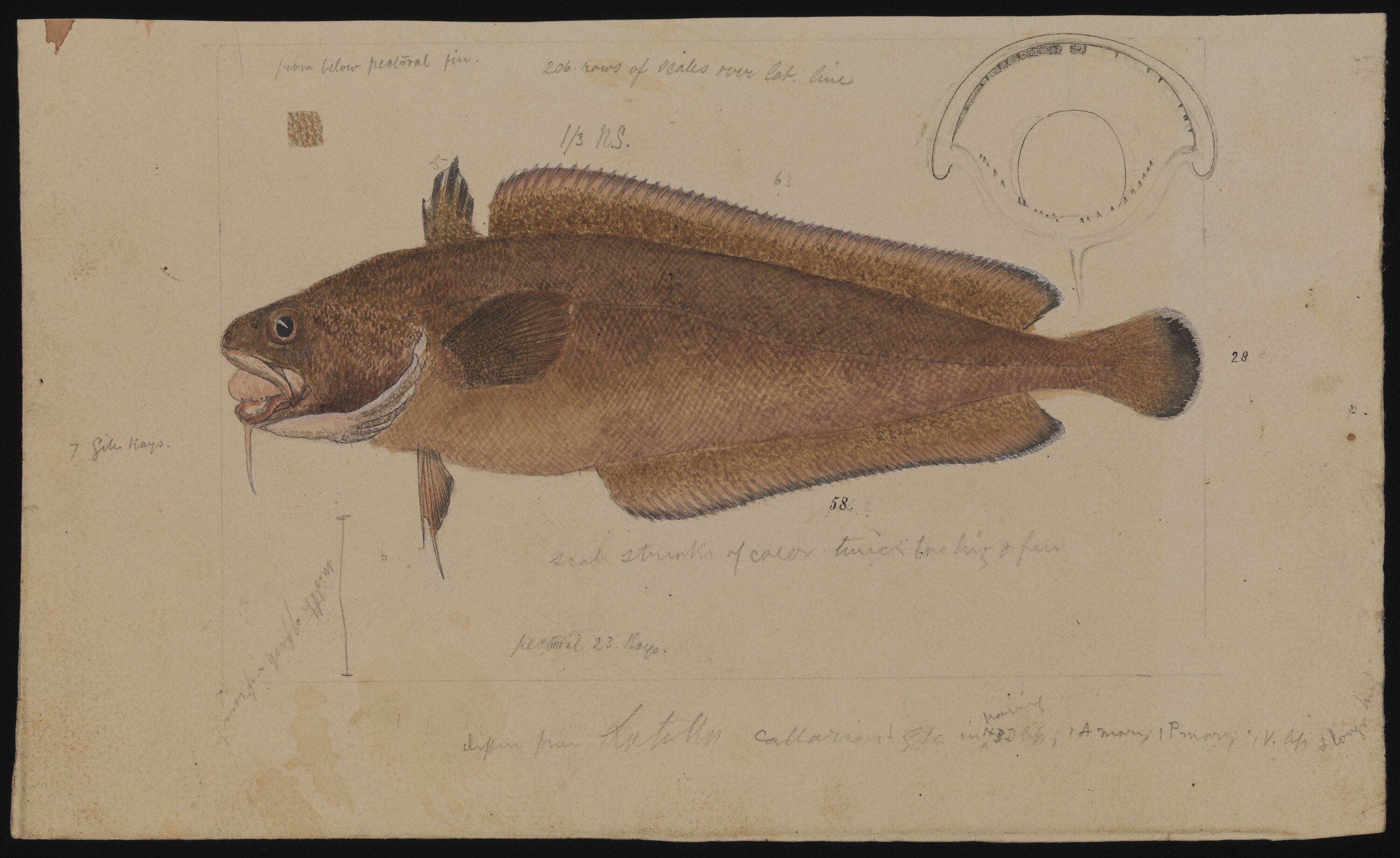 1/3 ns / [detail] from pectorla fin / 206 rows of scales over lat. Line / pectoral 26 rays
