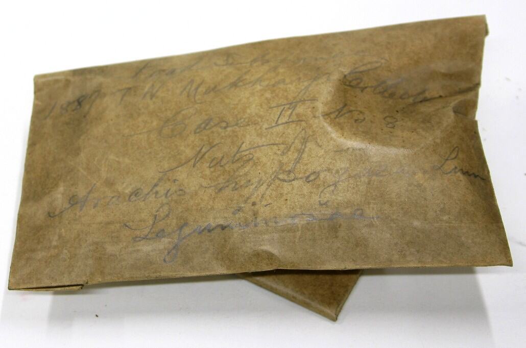 Sample envelope containing nuts from the ARACHIS HYPOGAEA (LEGUMINOSAE). Brown paper envelope is folded down, along top edge. Contents are handwritten on front of package in pencil.